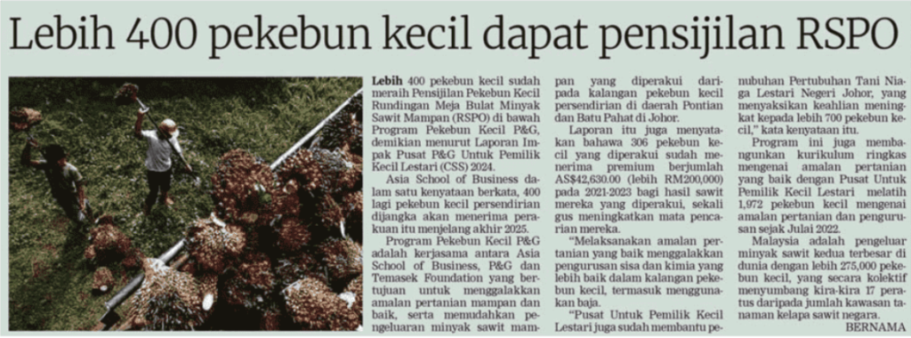 Program Pekebun Kecil P&G adalah kerjasama antara Asia School of Business, P&G, dan Temasek Foundation yang bertujuan untuk menggalakkan amalan pertanian yang mampan dan baik, serta memudahkan pengeluaran minyak sawit mampan yang diperakui daripada kalangan pekebun kecil persendirian di daerah Pontian dan Batu Pahat di Johor.