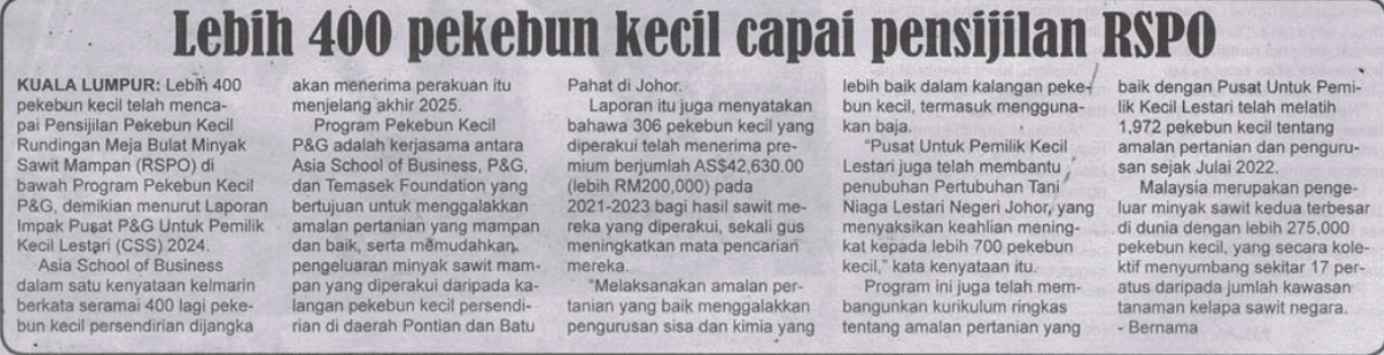 Lebih 400 Pekebun Kecil Capai Pensijilan RSPO