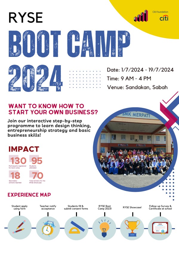 RYSE Boot Camp is a five-day programme designed to provide participants with an overview of small business development and entrepreneurial skills. A total of 18 schools in Sandakan participated in the programme, each sending one or two teams of up to 5 students per team.